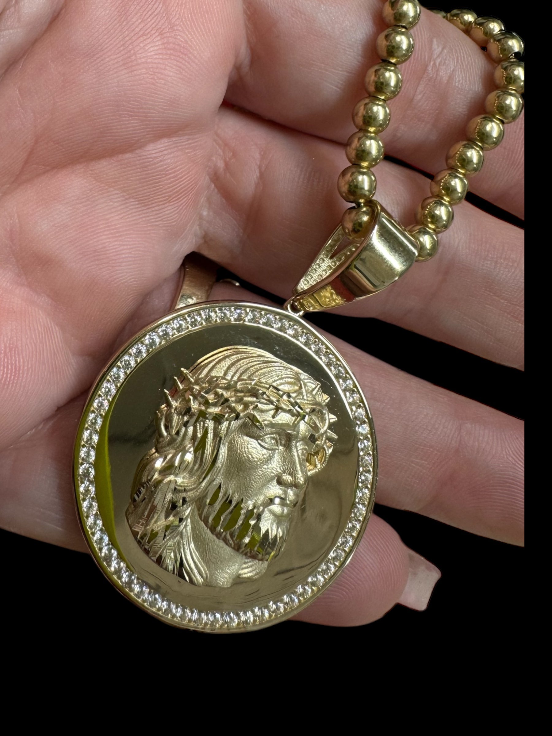 Ball necklace 14k /size 16 inch with charm Jesus christ 14k /1.8 inch x 1.5 1nch/ 16g all